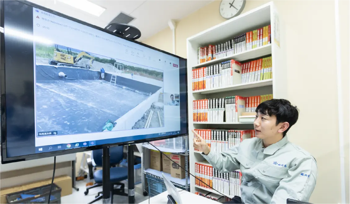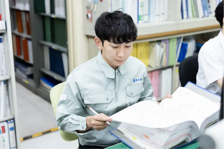 県民の生活に欠かせないインフラである「流域下水道施設」※の工事を発注・管理する部署に所属し、機械職として、機械設備の工事計画や図面作成、積算(工事費用の算出)などを担当しています。工事が始まると現場へ足を運び、計画通り安全に工事が進んでいるかを確認するのも重要な仕事です。現場では豊富な経験を持つ技術者の方々と接する機会が多く、常に学ぶ姿勢を忘れず、円滑なコミュニケーションを心がけています。